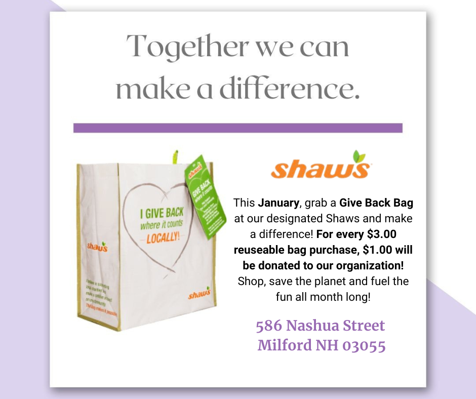 This January, grab a Give Back Bag at our designated Shaws and make a difference! For every $3.00 reuseable bag purchase, $1.00 will be donated to our organization! Shop, save the planet and fuel the fun all month long!